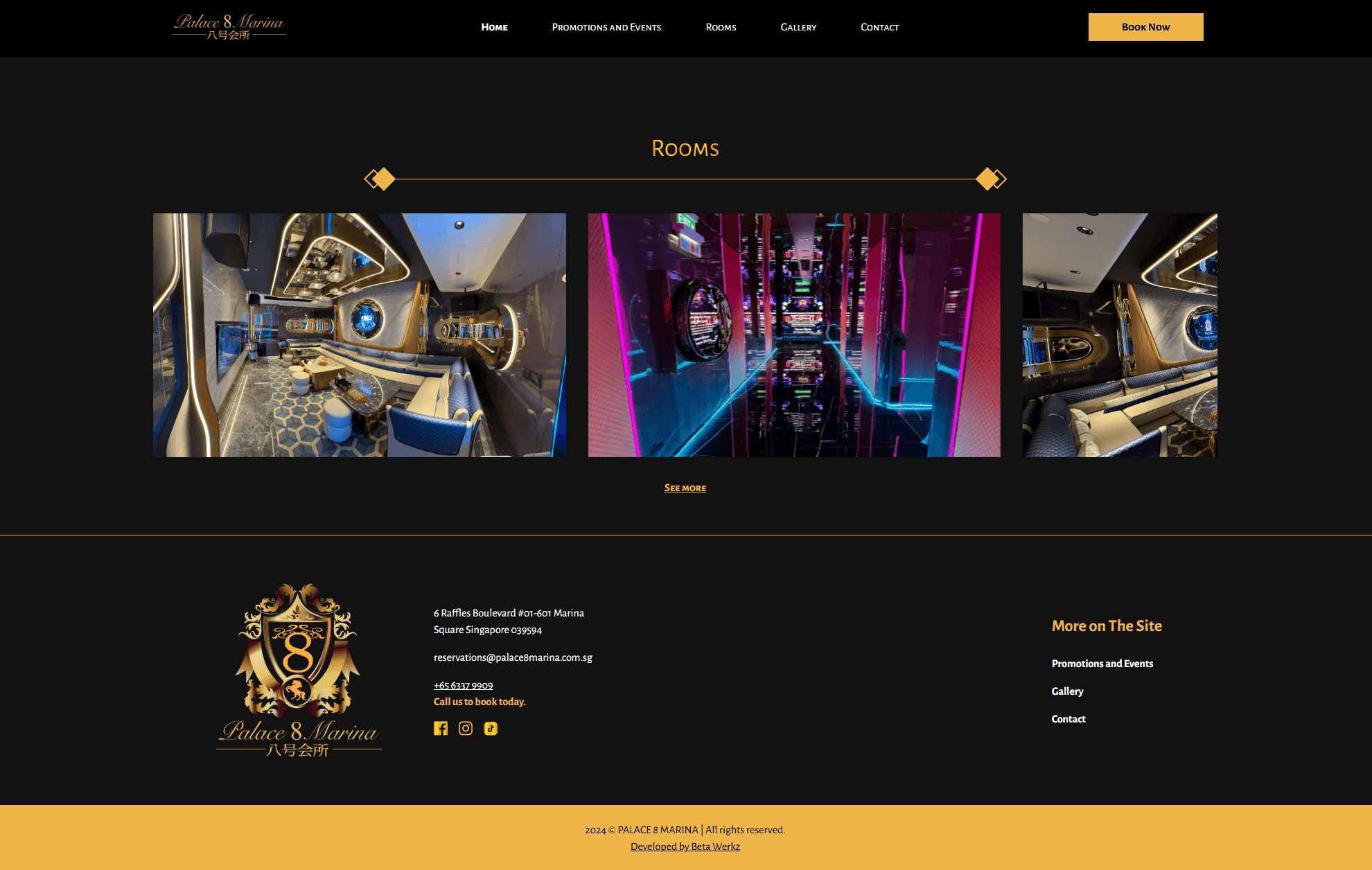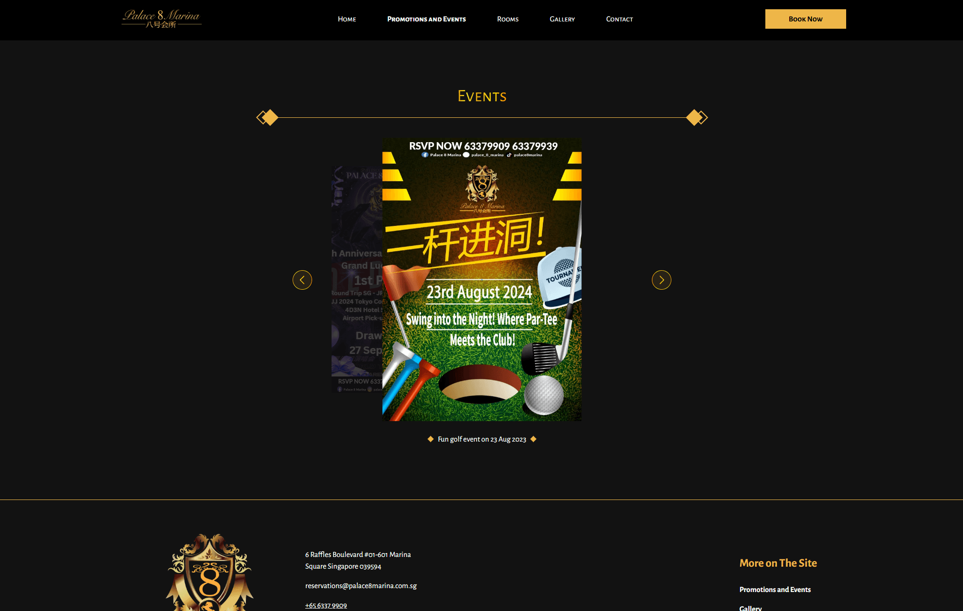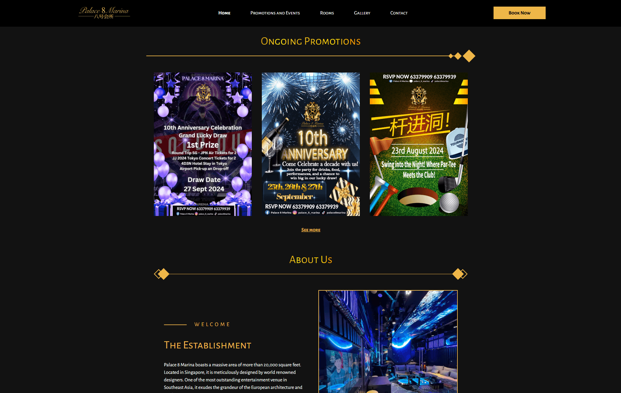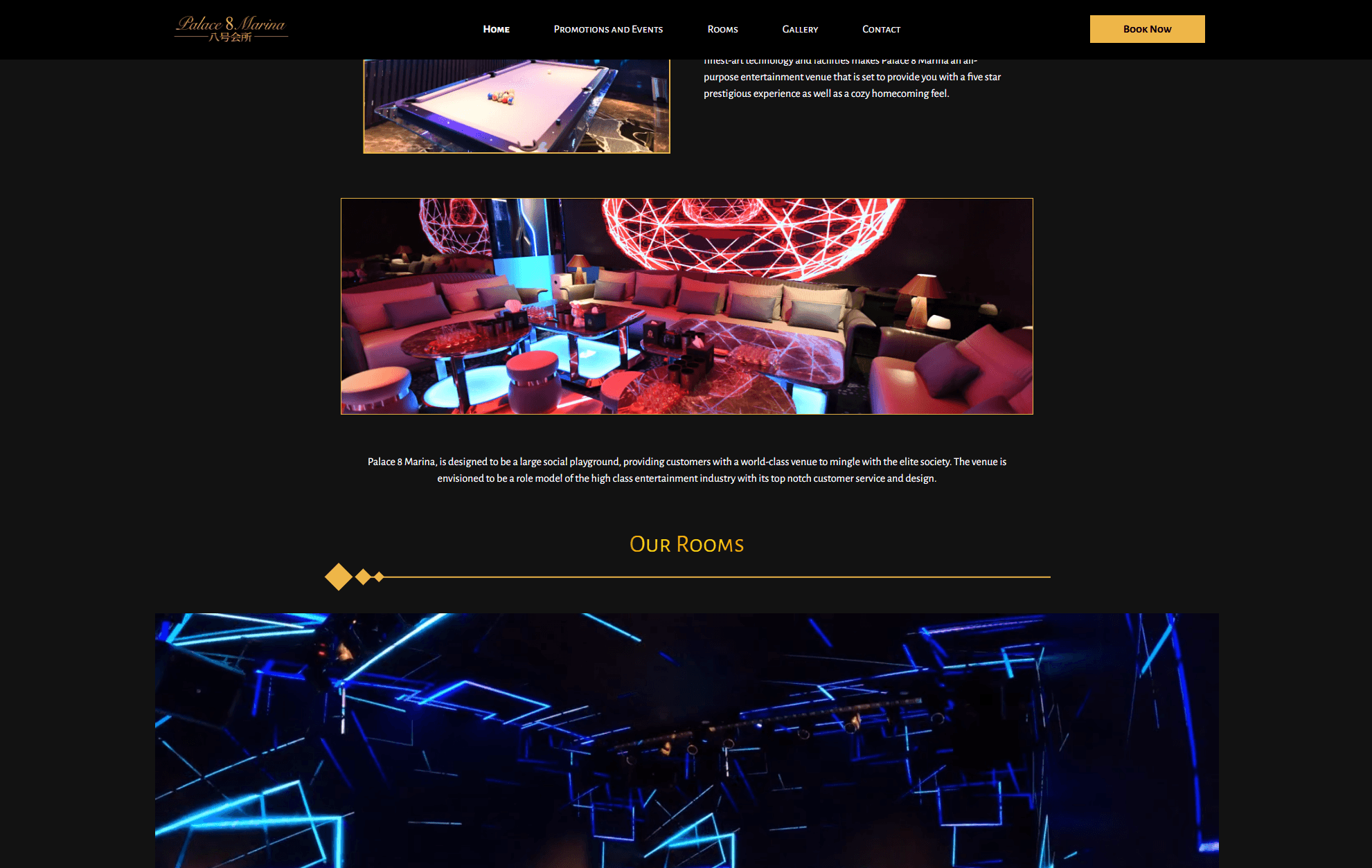 Palace 8 Marina’s brand colours of black and gold were chosen to evoke a classy and elegant atmosphere. The dark theme complements their event graphics and room photography, which often feature neon and vibrant colours, allowing those visuals to stand out while maintaining a luxurious overall aesthetic.