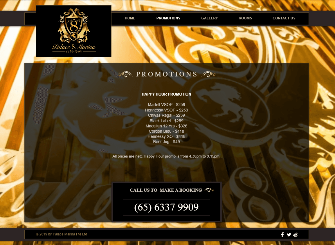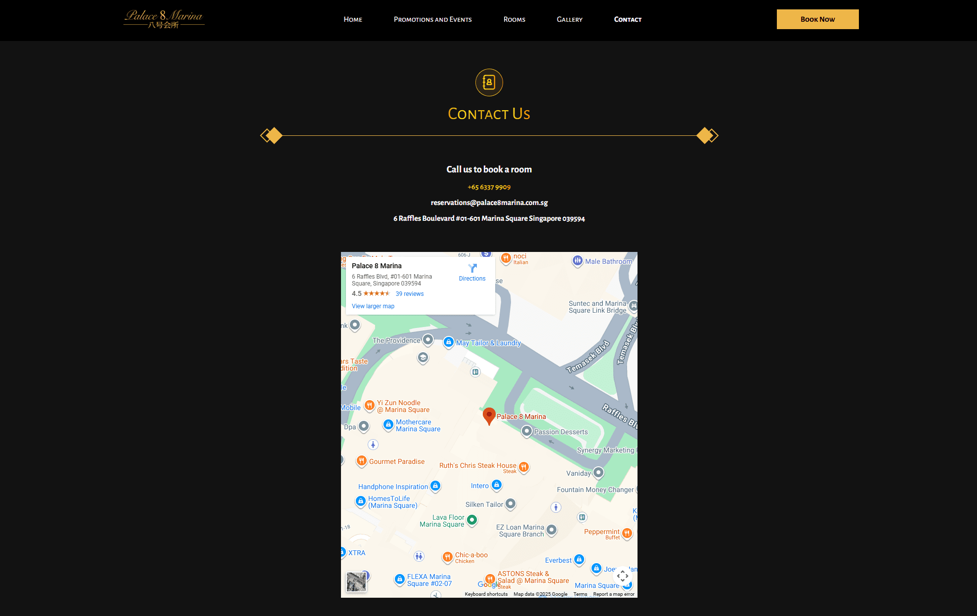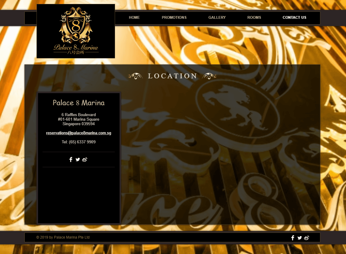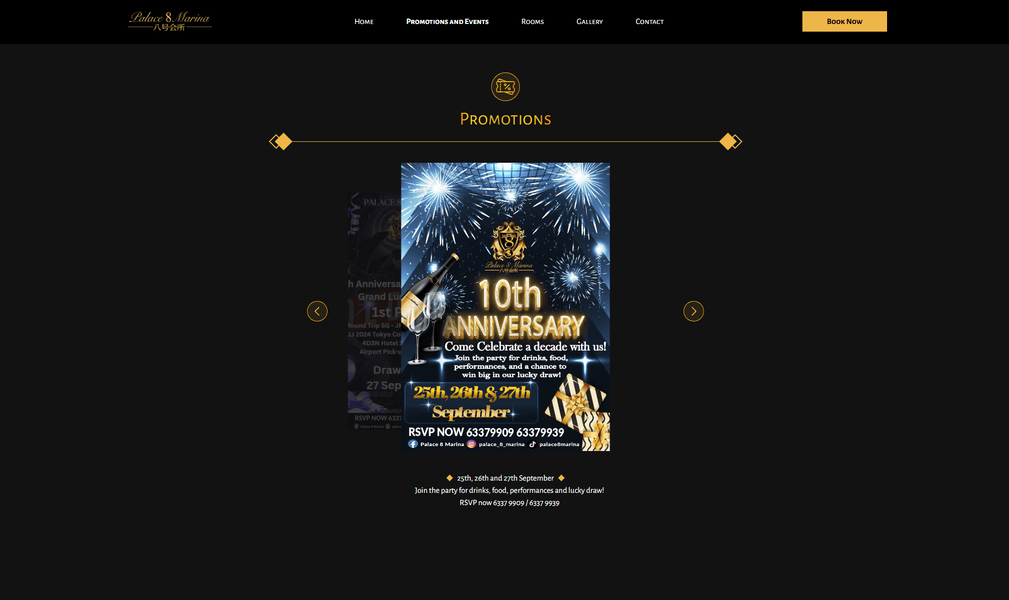 Palace 8 Marina’s brand colours of black and gold were chosen to evoke a classy and elegant atmosphere. The dark theme complements their event graphics and room photography, which often feature neon and vibrant colours, allowing those visuals to stand out while maintaining a luxurious overall aesthetic.