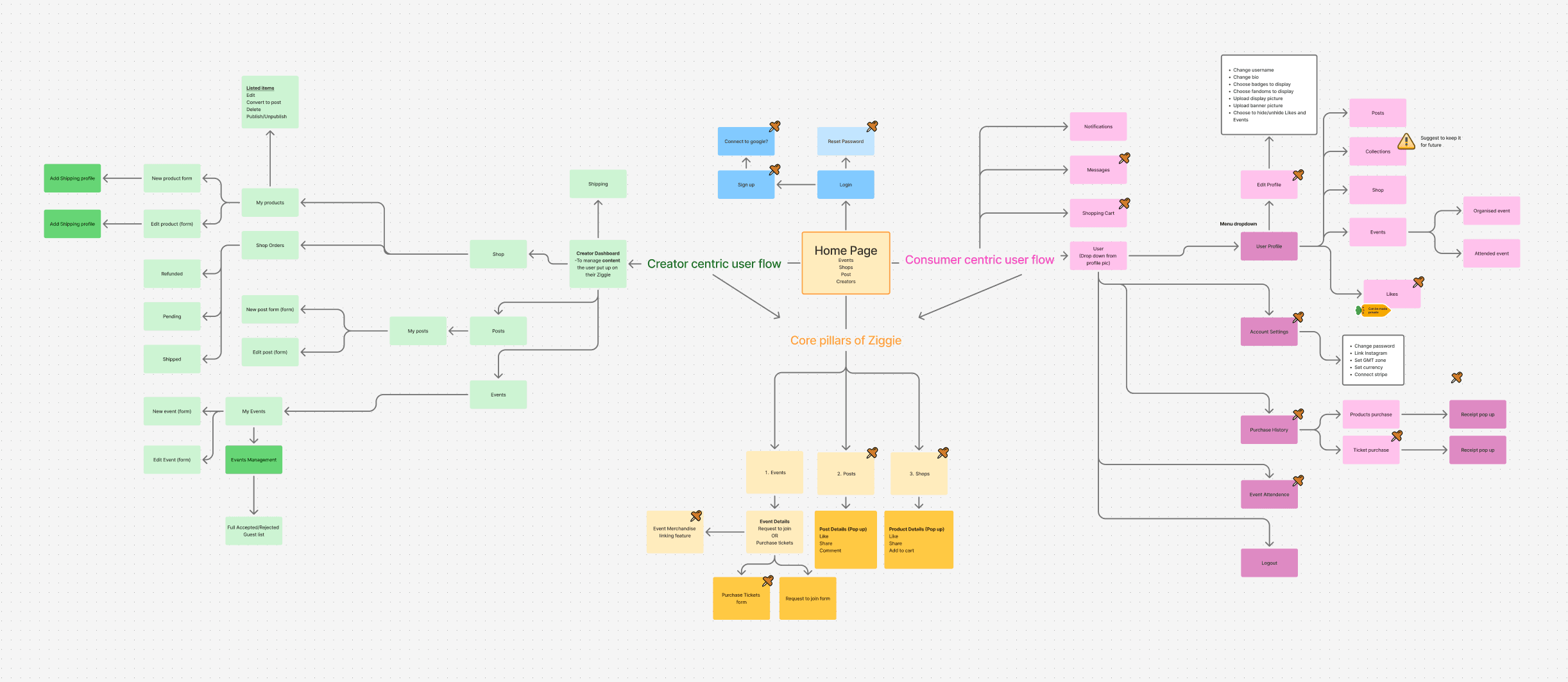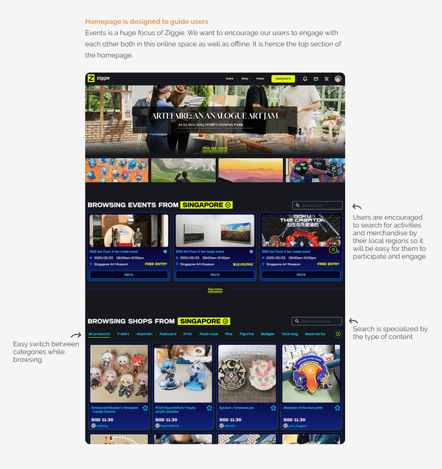 With the user flow nailed down, we came up with 3 main pillars of Ziggie site, which are the Events discovery, Posts discovery and Shop. The 3 pillars should be seamlessly linked to optimise discovery and engagement for the users.