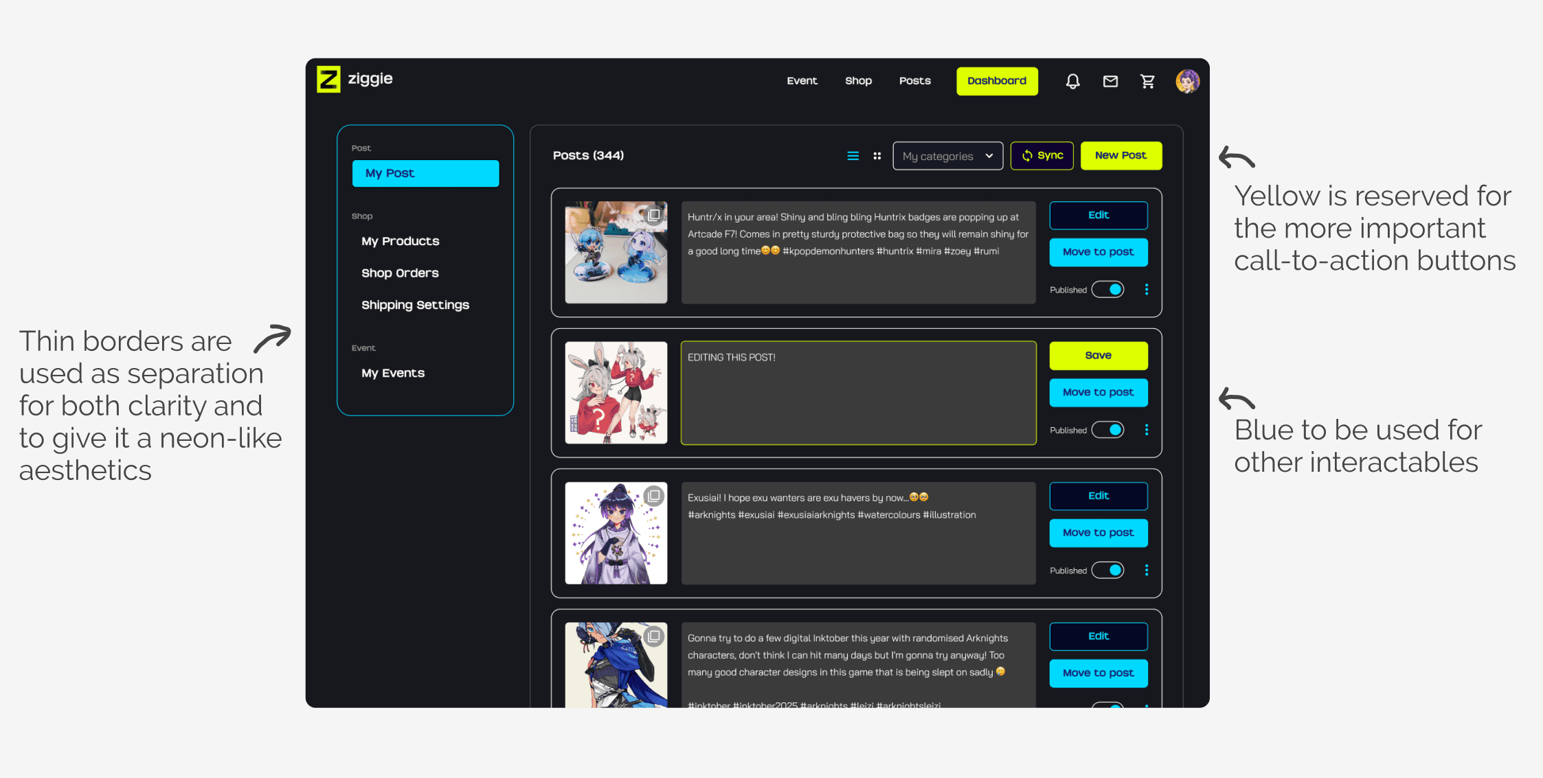 Originally white, Ziggie received feedbacks that it was too “corporate” and generic. Since fostering a sense of identity among users is an important aspect of Ziggie’s goal, we decided to revamp the site for a flashier site with cyberpunk asesthetics, all while maintaining readability and accessibility.