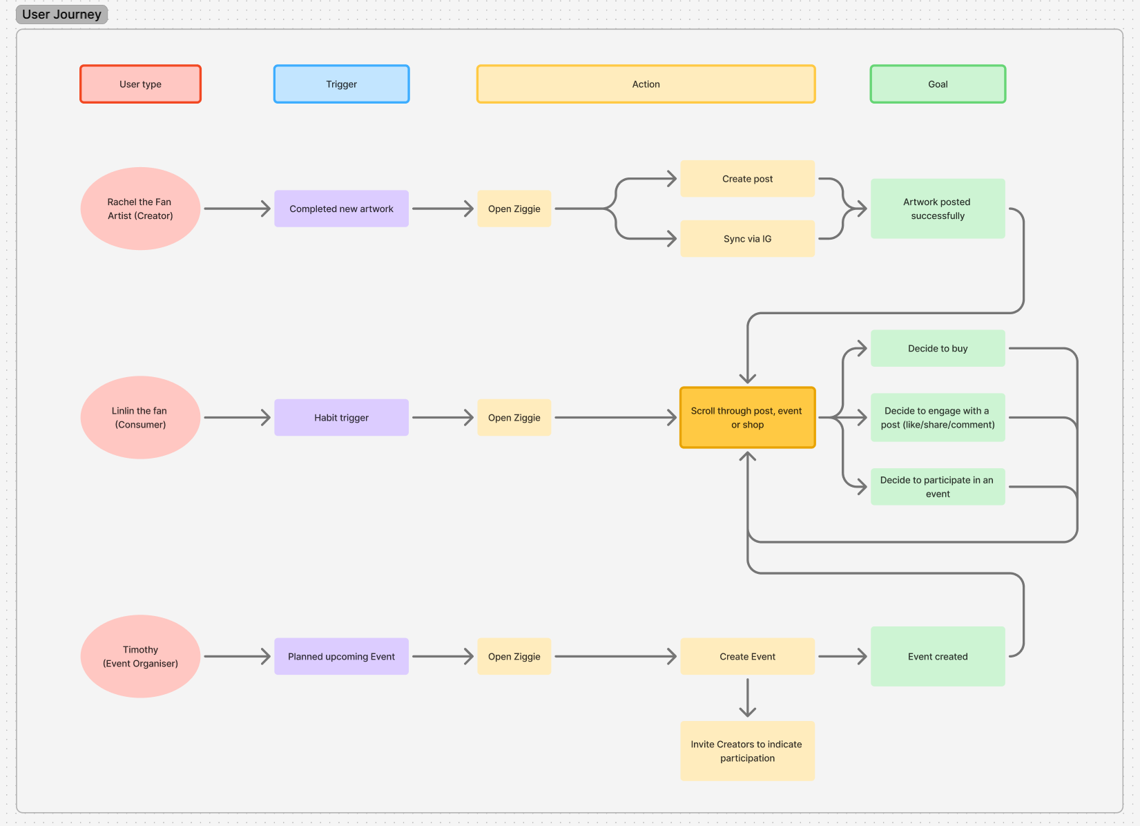 After identifying our main target audiences, we set out to analyse the user flow of each party of users. This helps in figuring out the important main features Ziggie needs to have.